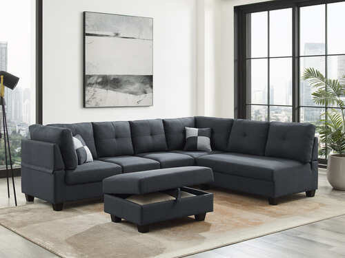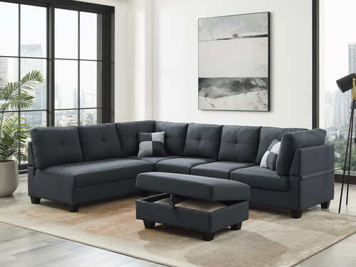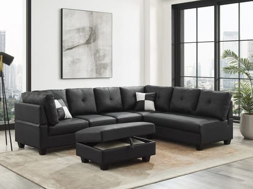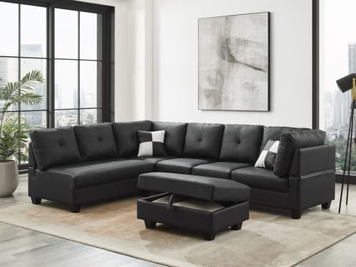 This classic sofa embodies calmness and competence. PU wrapped on eucalyptus wood frame, medium comfort. The chaise can be reoriented from left to right to fit your space. The easy storage Ottoman, the plastic feet are durable and protect the floor well.